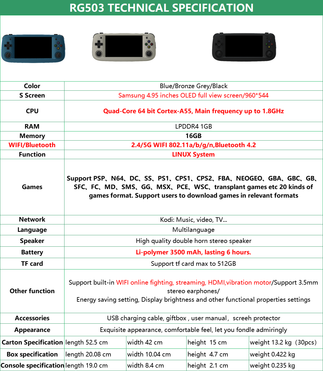 -- Speicher:16 GB (integriert 16 GB, kein Spiel); 80 GB (integriert 16 GB + 64 GB TF-Karte, kompatible 4193-Spiele)